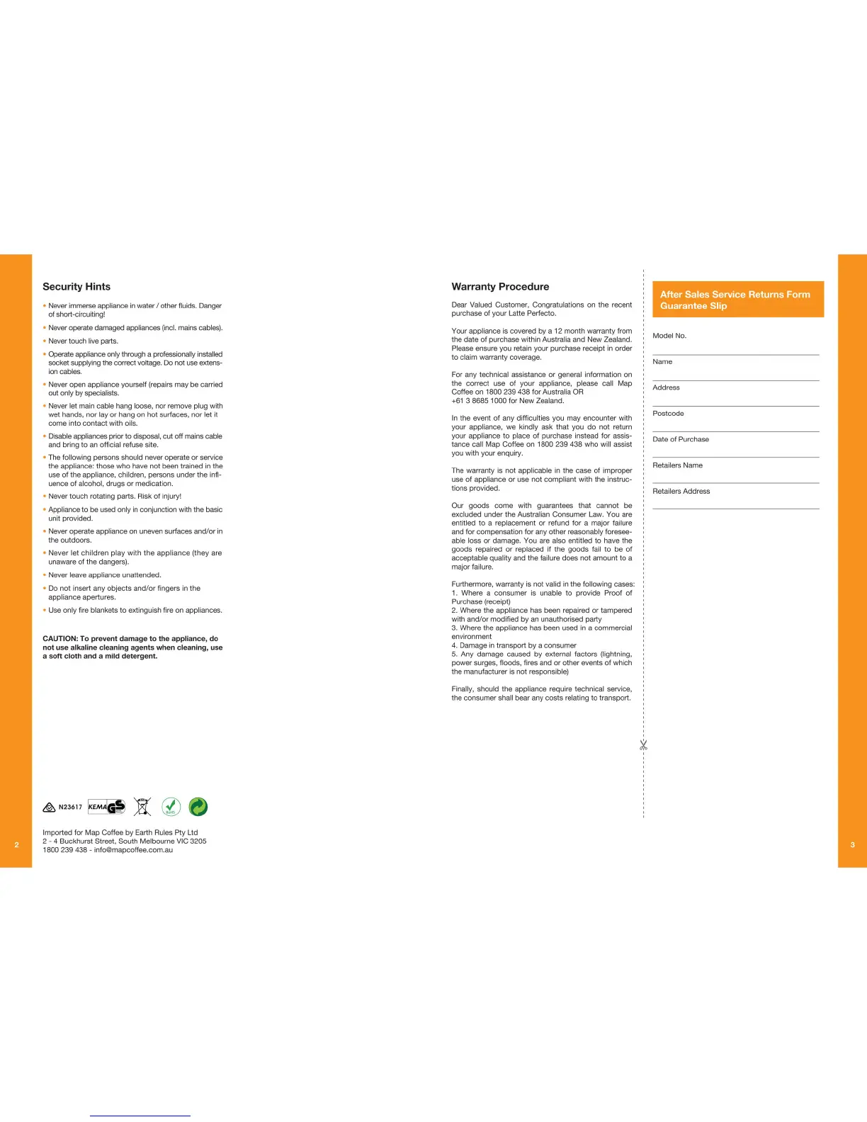 Map Latte Perfecto MMF-009 - Security Hints; Warranty Procedure; After Sales Service Returns Form