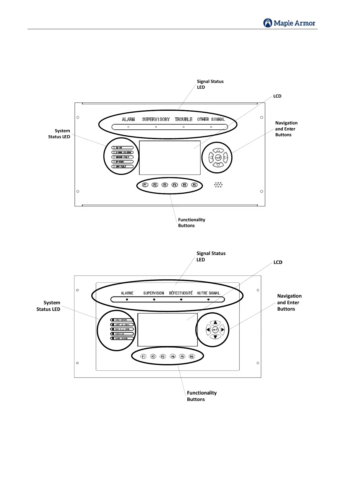5systemstatusLEDs,4navigationbuttonsand1enterbutton,6functionalitybuttonsandabuzzer.
