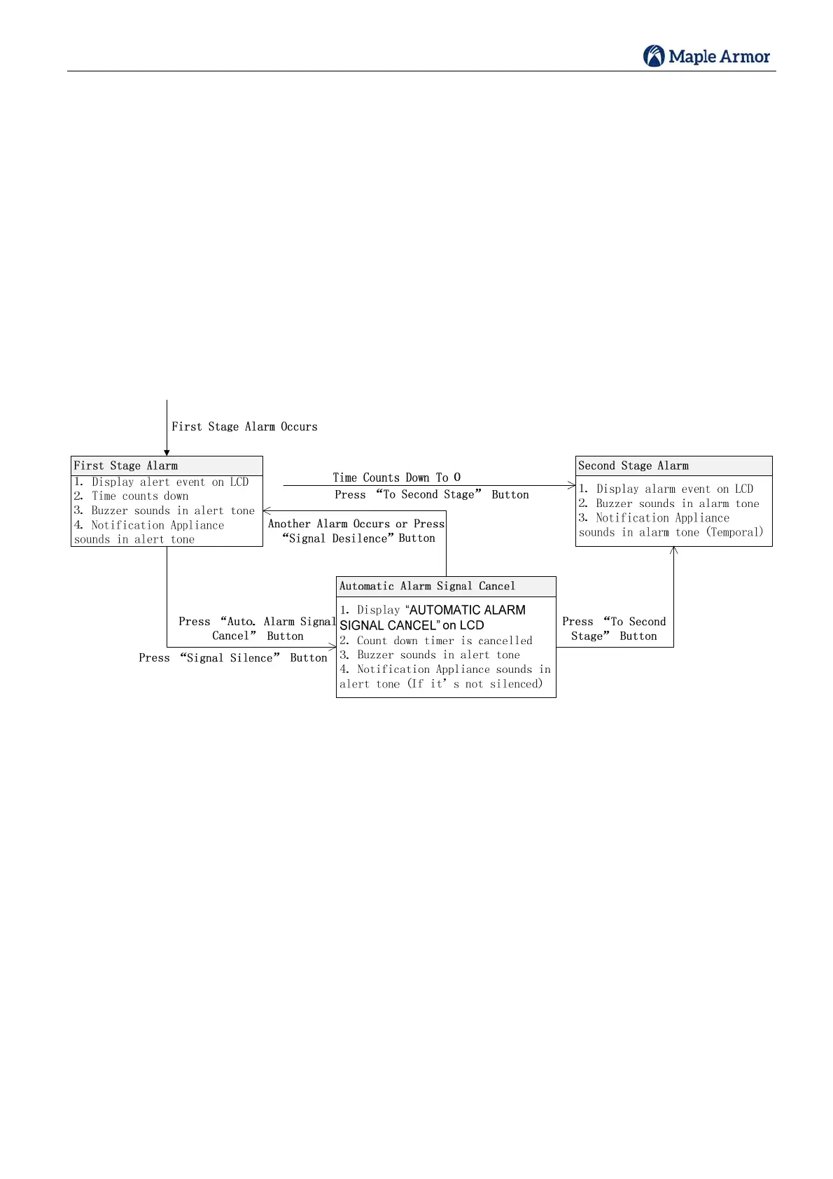 Ifthetimercountsdownto0orpressing“ToSecondStage”button,systemwillentersecondstagealarmstatus.
