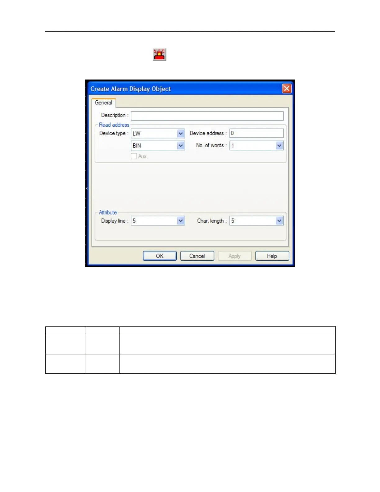 2. Use the Description: box to enter a title for the Alarm Display part. A description is not