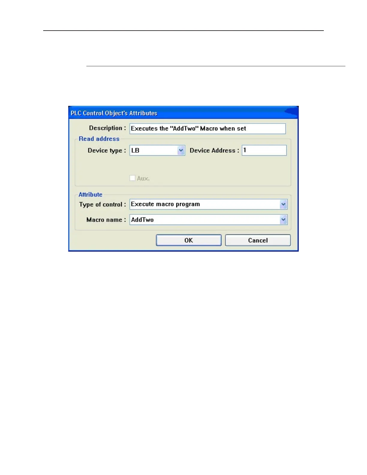 Below shows the PLC control object attribute window.