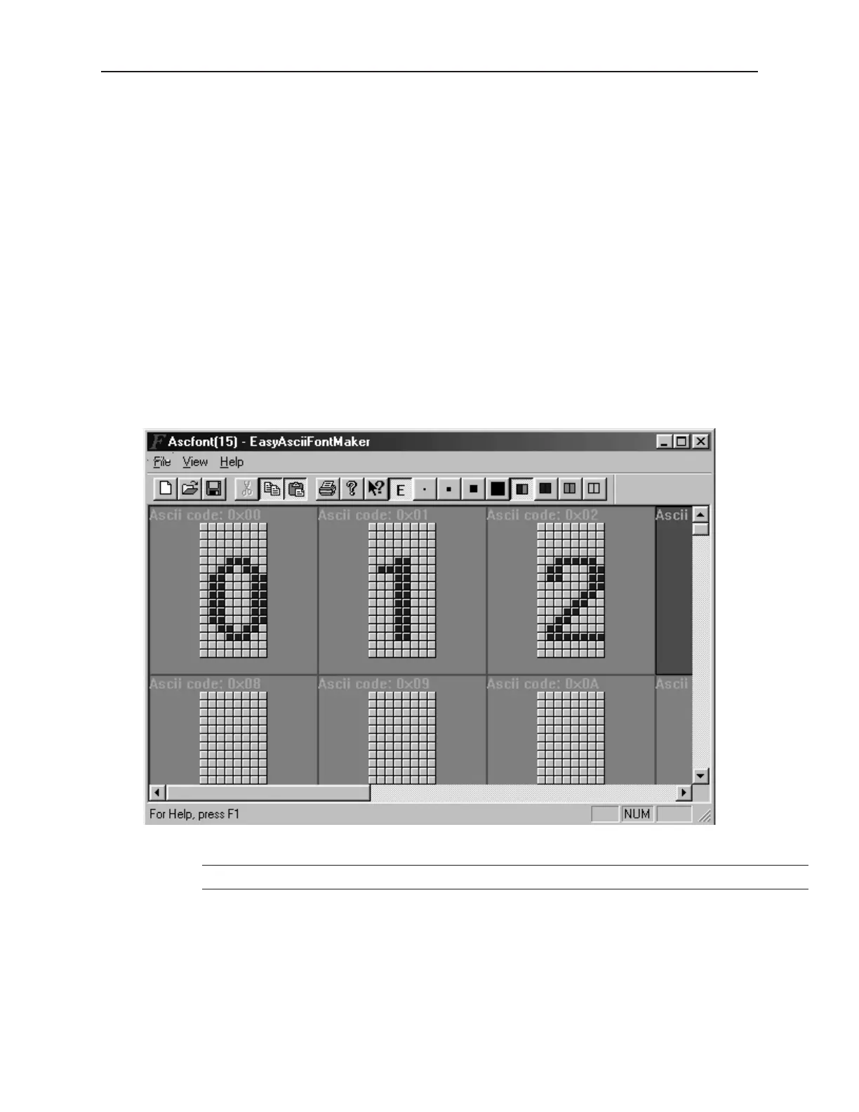 The fol low ing il lus tra tion shows the ASCIIFontMaker ap pli ca tion screen with the ASCFONT.16 file opened:
