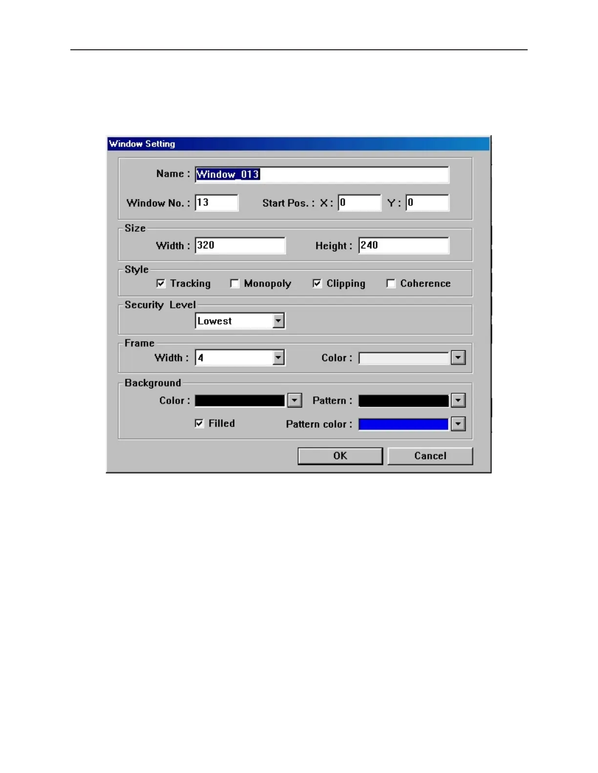 position is labeled Start Pos: in the Window Setting Dialog box. The X and Y positions refer to the pixel location of