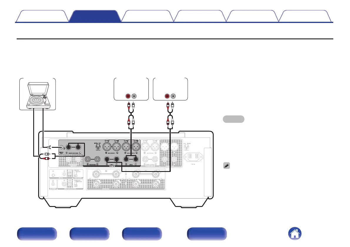 You can connect turntables, network audio players and CD players to this unit. Set the phono equalizer of this unit in the “Phono” section of the setting