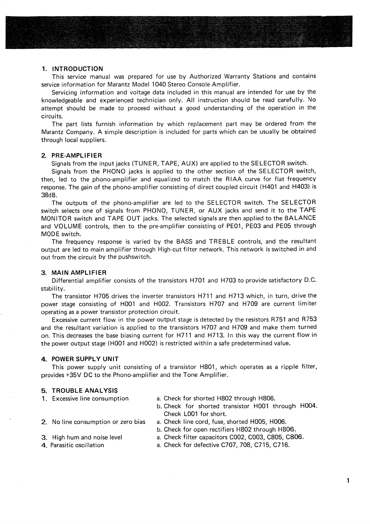 Marantz 1040 - Pre-Amplifier Stage; Main Amplifier Circuitry; Power Supply Unit Operation; Trouble Analysis and Solutions