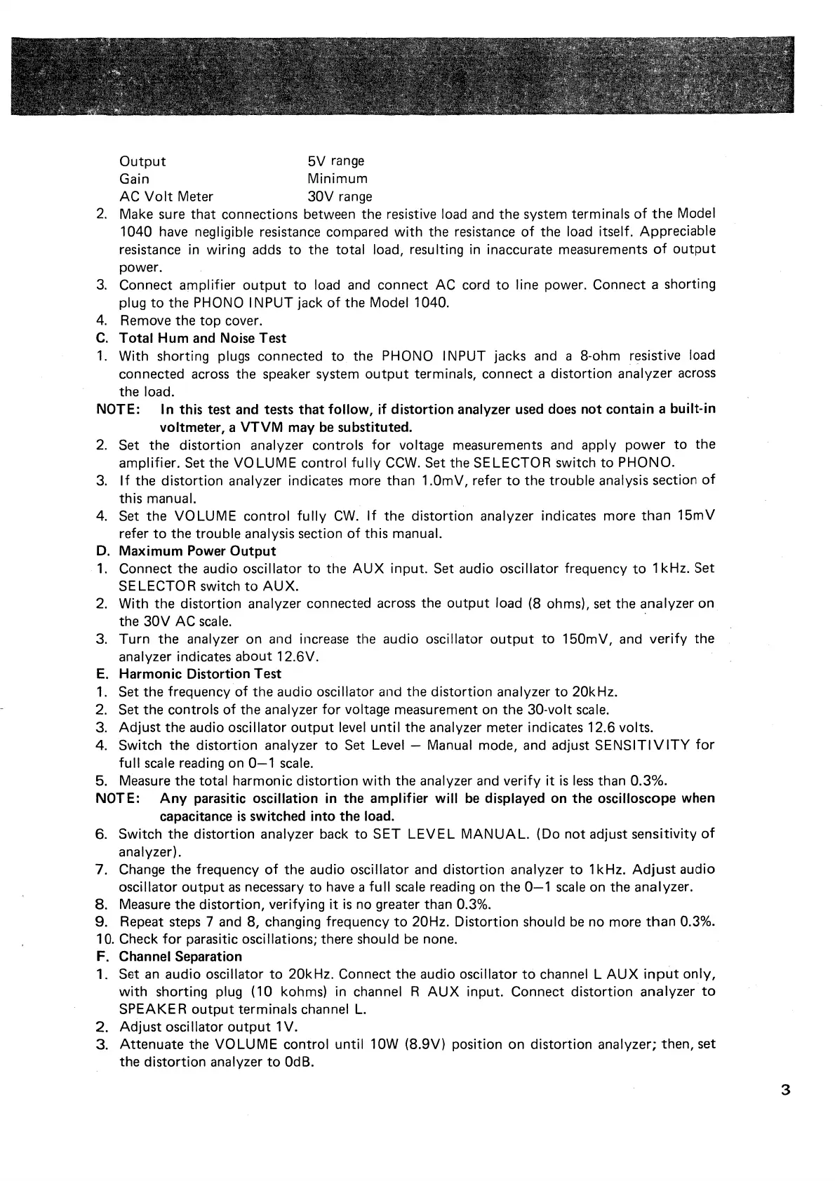 Marantz 1040 - Total Hum and Noise Measurement; Maximum Power Output Determination; Harmonic Distortion Measurement; Channel Separation Test