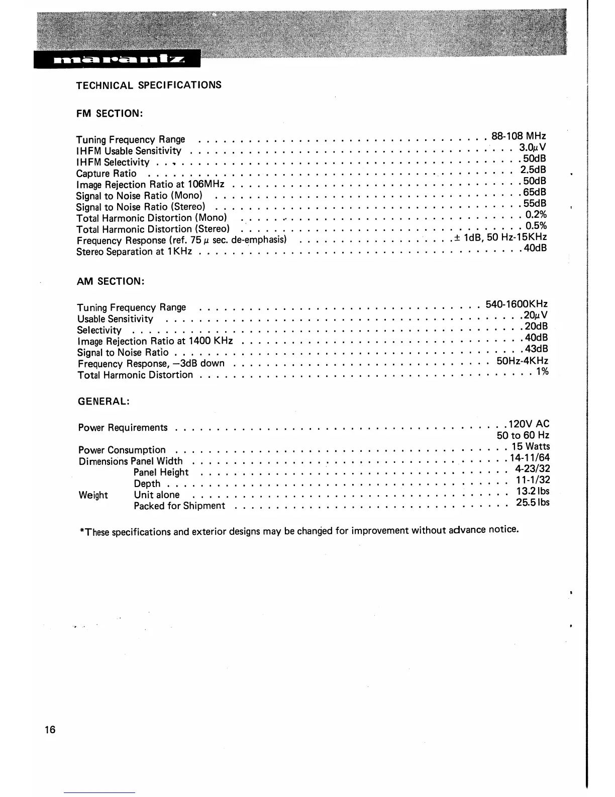 Marantz 105 - Marantz Model 105 Technical Specifications; FM Section Specifications; AM Section Specifications; General Unit Specifications