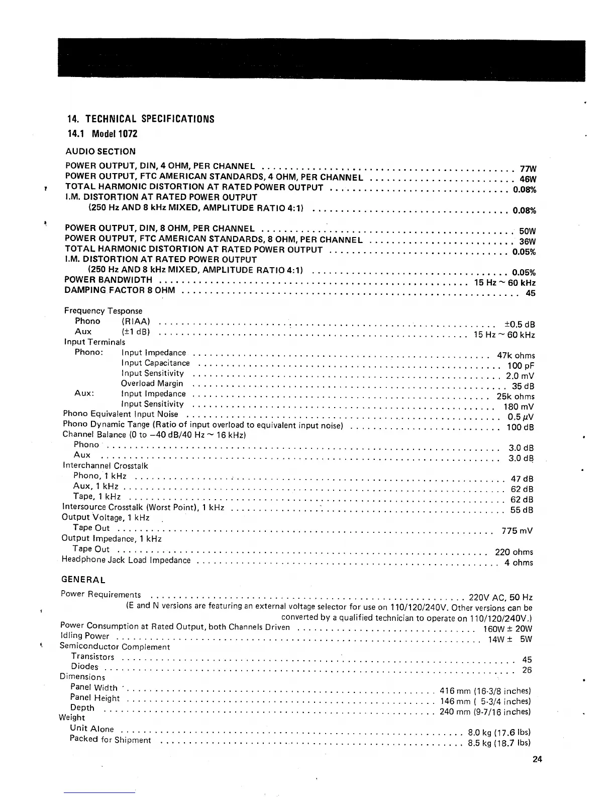 Marantz 1050 - TECHNICAL SPECIFICATIONS; Model 1072 Specifications
