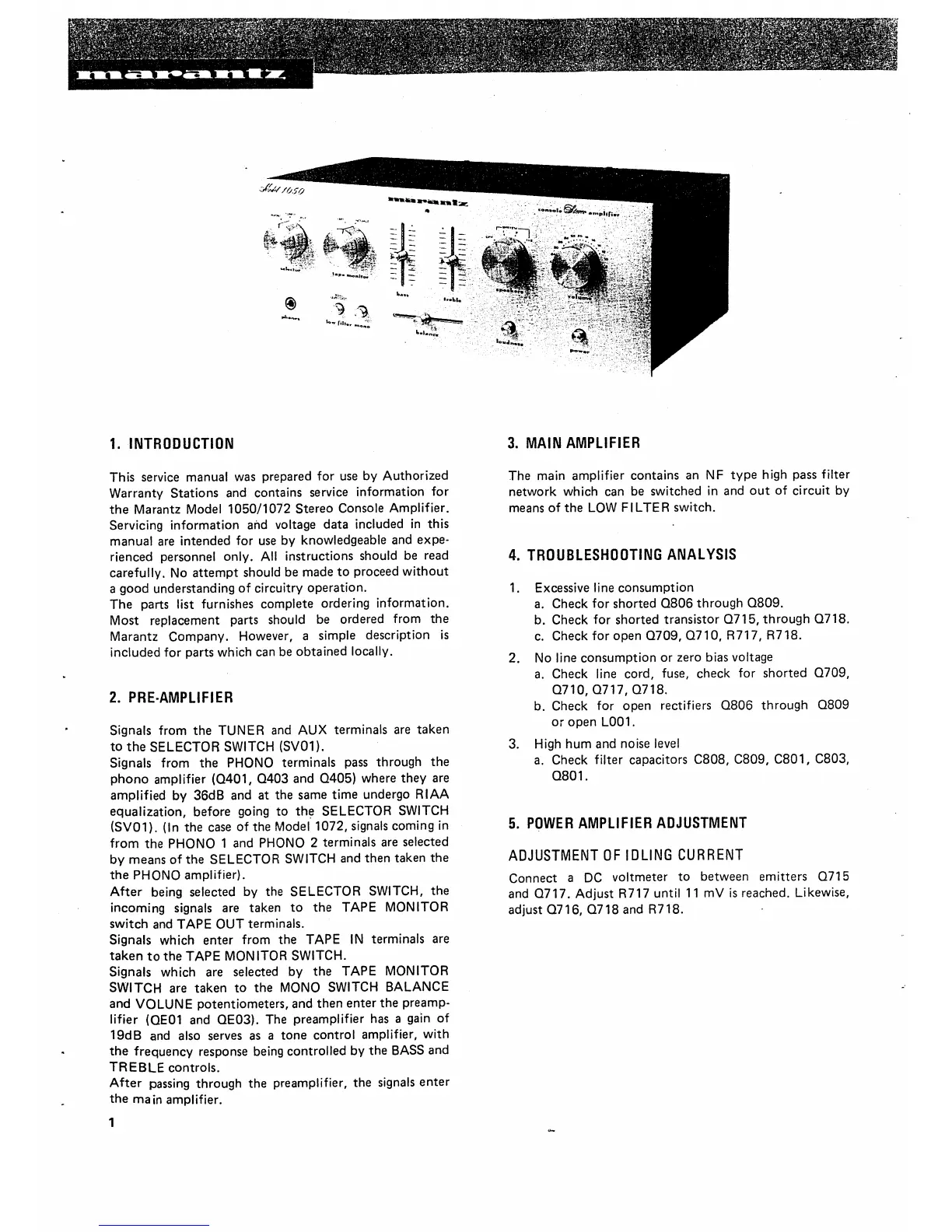 Marantz 1050 - INTRODUCTION; PRE-AMPLIFIER; MAIN AMPLIFIER; TROUBLESHOOTING ANALYSIS