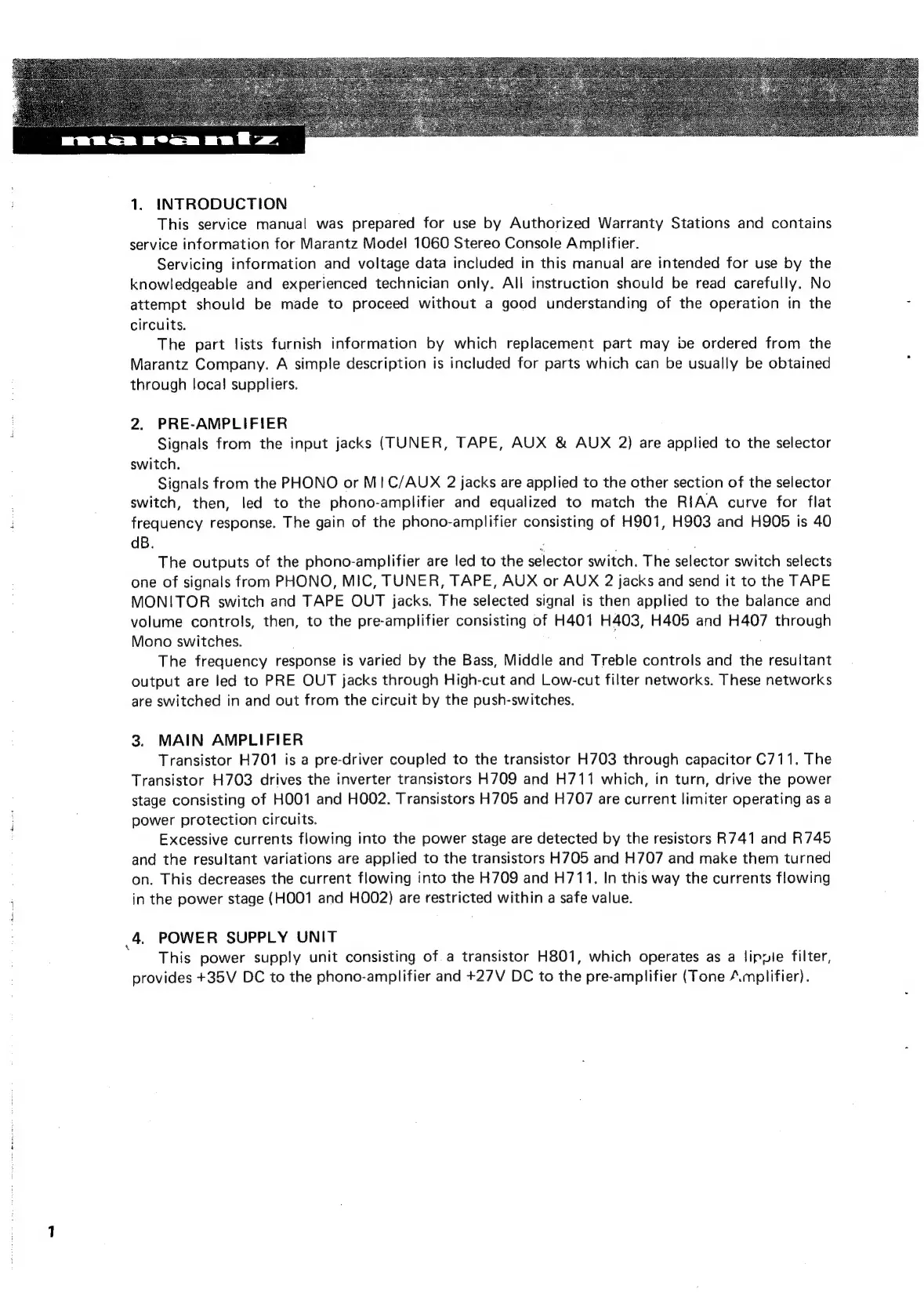 Marantz 1060 - Introduction; Introduction to Service Manual; Amplifier Block Descriptions; Pre-Amplifier Section