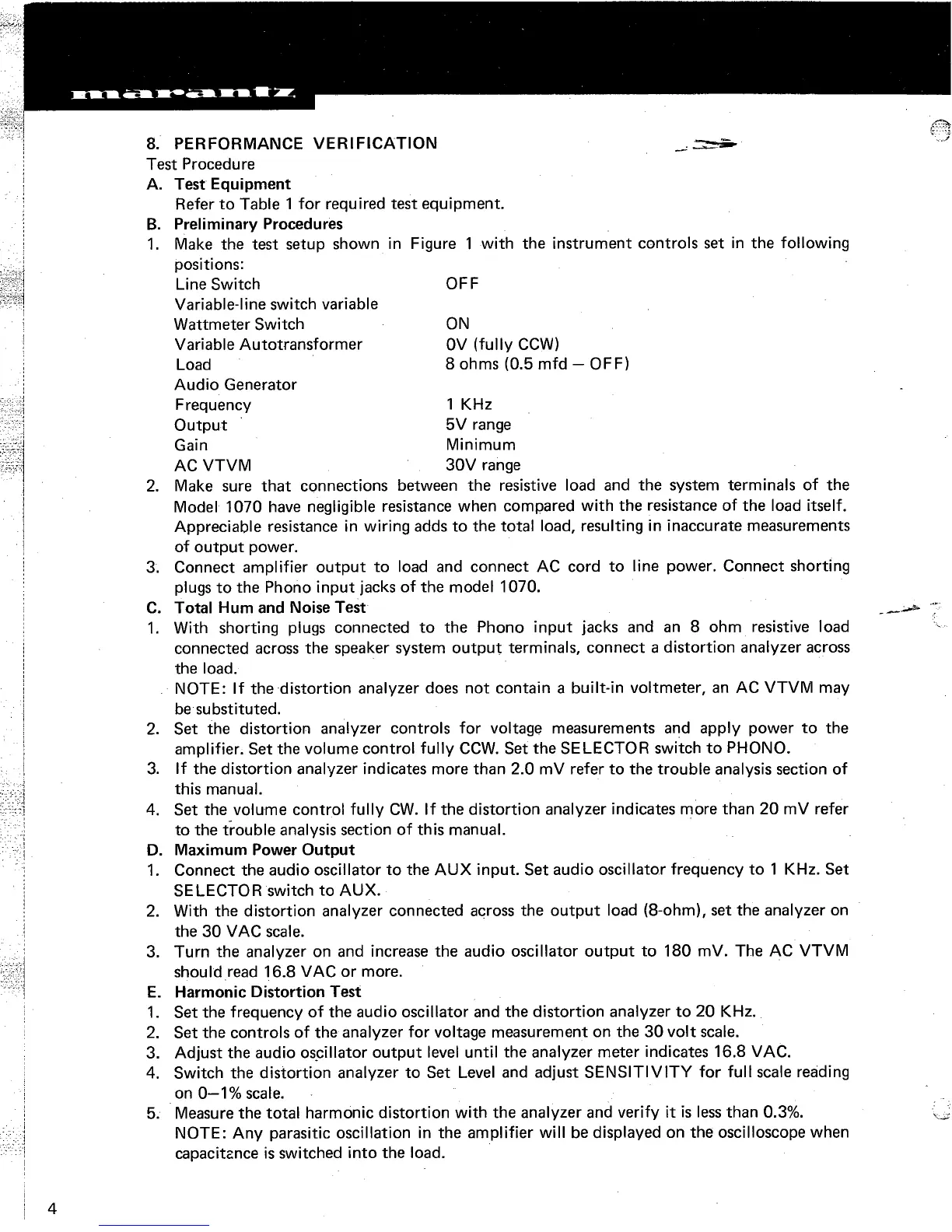Marantz 1070 - Performance Verification; Test Equipment; Preliminary Procedures; Total Hum and Noise Test