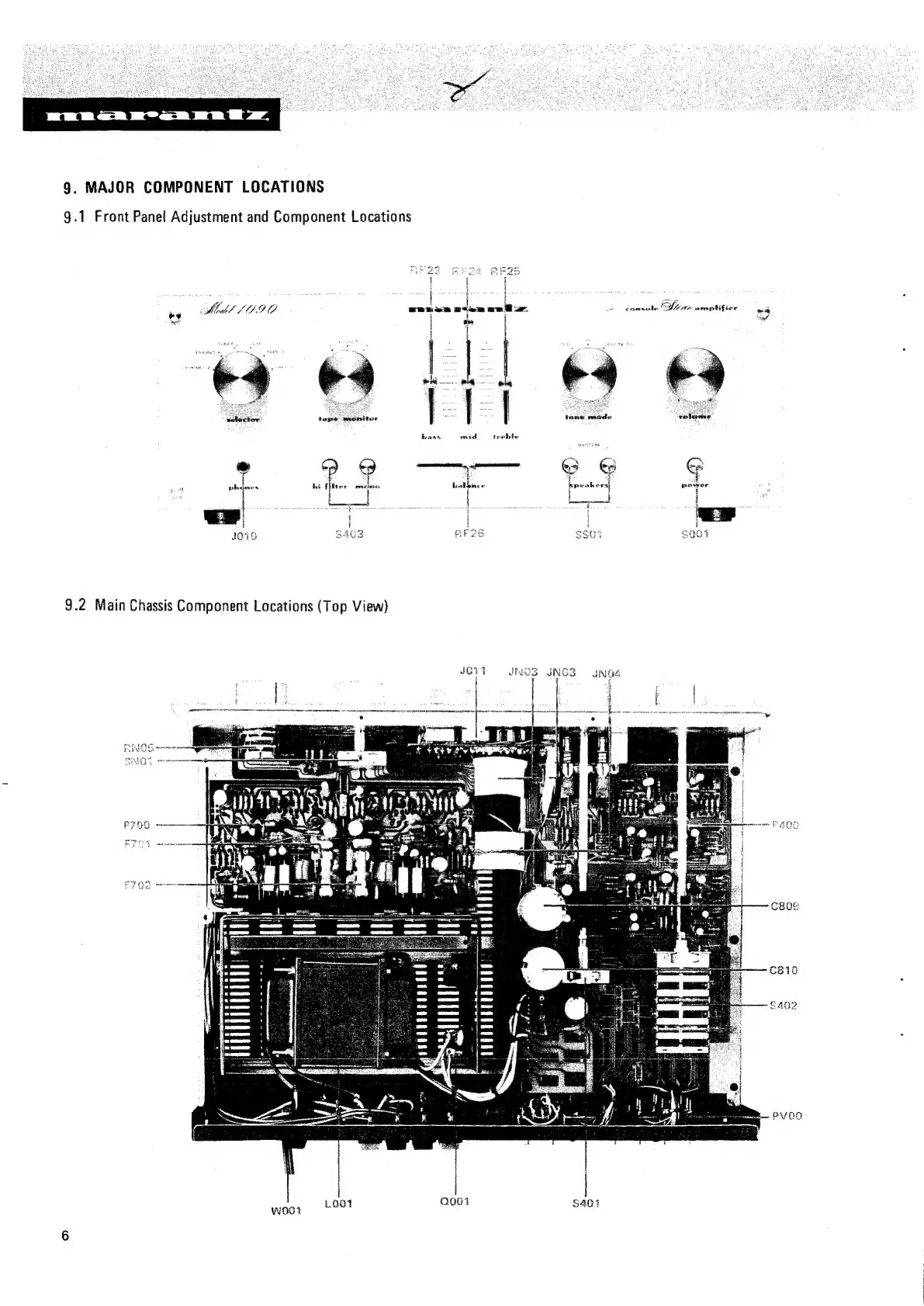 Marantz 1090 - 9. MAJOR COMPONENT LOCATIONS; Front Panel Component Locations; Main Chassis Top View Component Locations