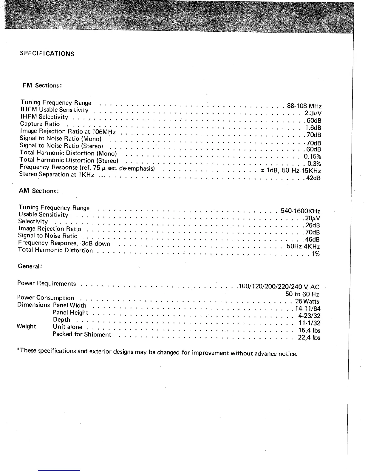 Marantz 110 - Specifications; FM Section Specifications; AM Section Specifications; General Specifications
