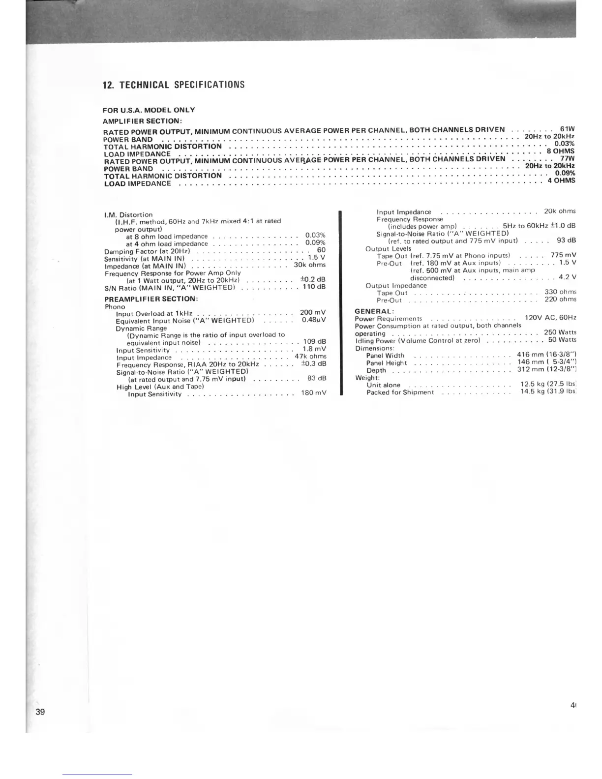 Marantz 1122DC - Technical Specifications for USA Model; Amplifier and Preamplifier Specs; General Unit Specifications