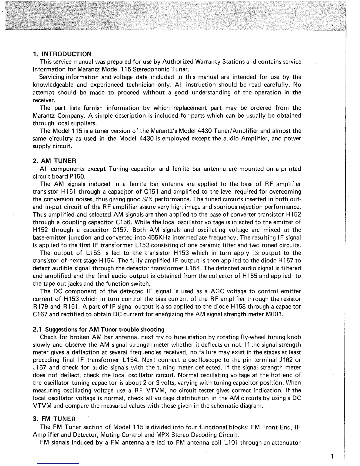Marantz 115 - Introduction; AM Tuner Operations and Troubleshooting; AM Tuner Circuit Description; AM Tuner Troubleshooting Guide