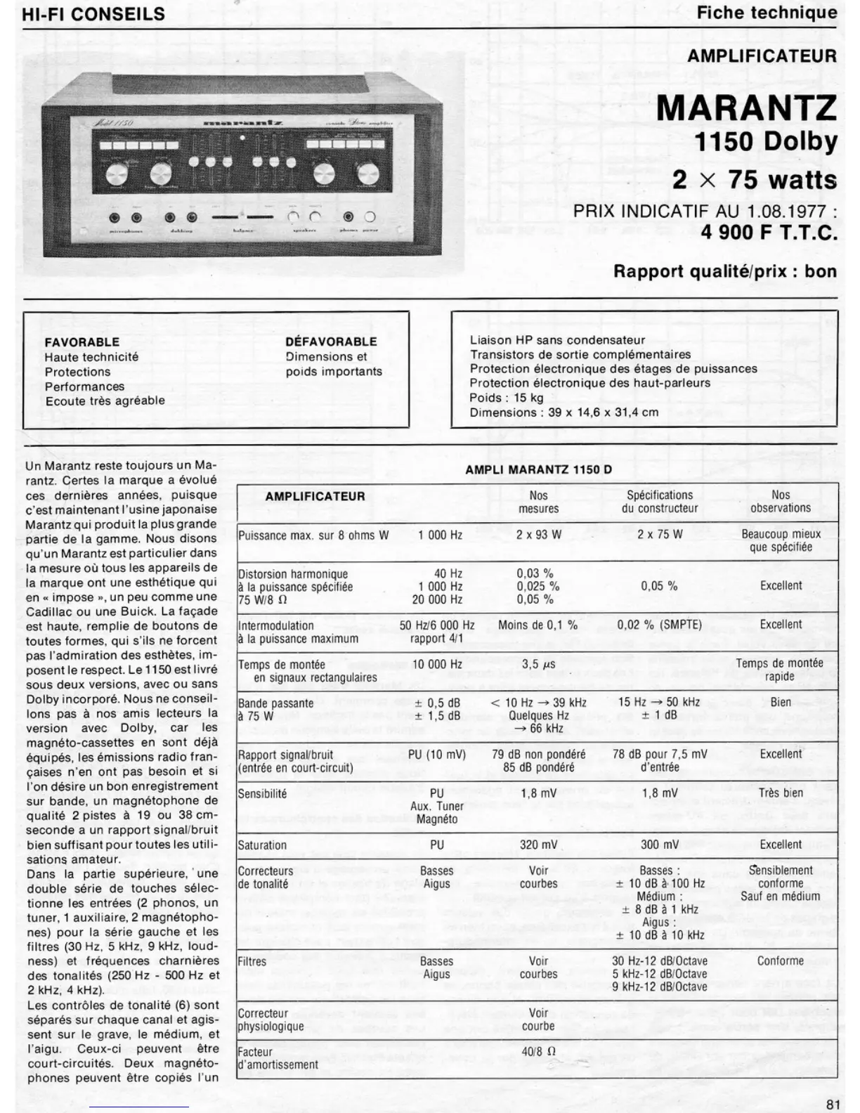 Marantz 1150 - AMPLIFIER SPECIFICATIONS; RATED POWER OUTPUT; FREQUENCY RESPONSE AND DISTORTION; INPUT SENSITIVITY AND IMPEDANCE