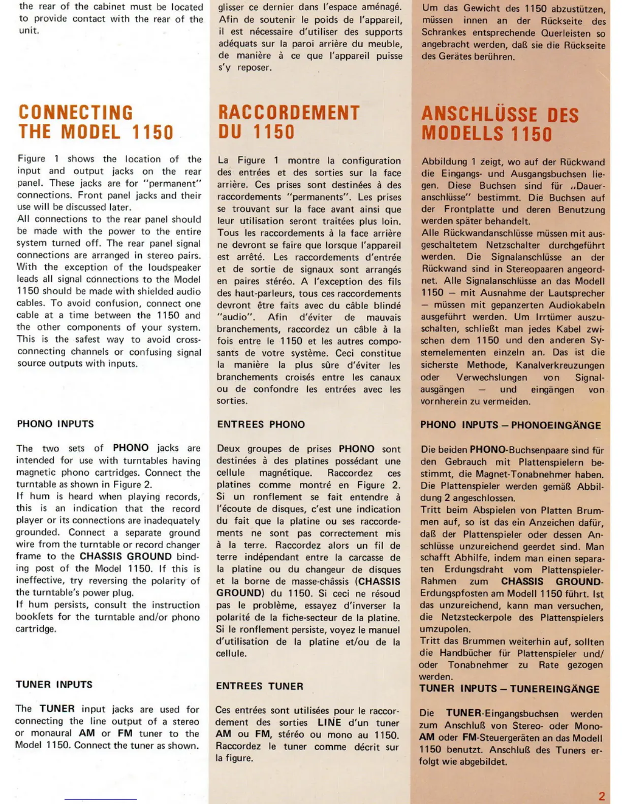 Marantz 1150 - CONNECTING THE MODEL 1150; INPUT JACKS
