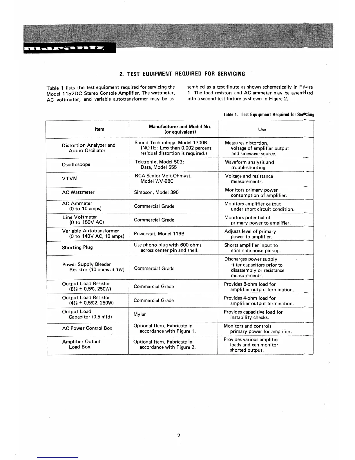 Marantz 1152DC - 2. TEST EQUIPMENT REQUIRED FOR SERVICING; Required Servicing Equipment