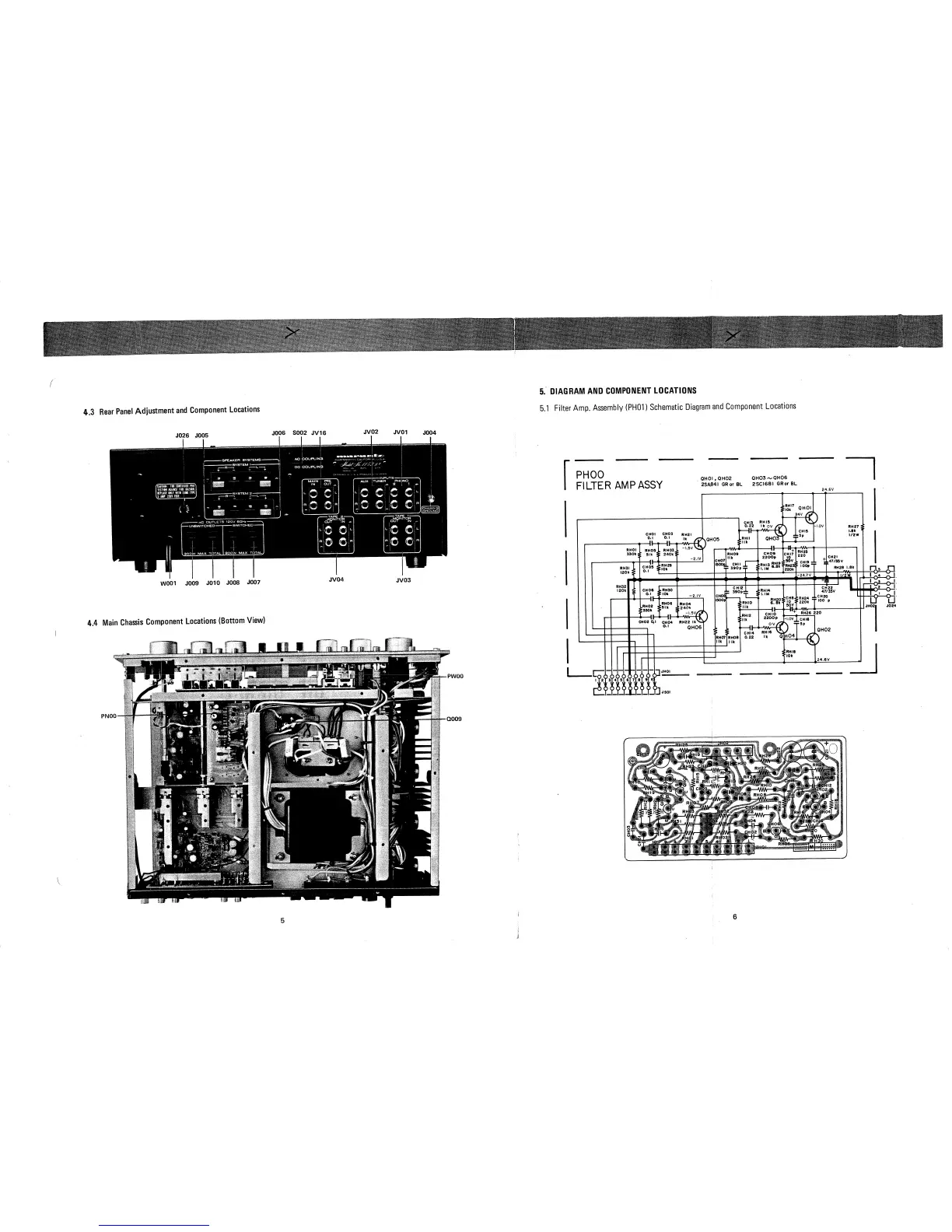 Marantz 1152DC - 4.3 Rear Panel Component Locations; 4.4 Main Chassis Component Locations (Bottom View); 5. DIAGRAM AND COMPONENT LOCATIONS; 5.1 Filter Amp. Assembly Schematic