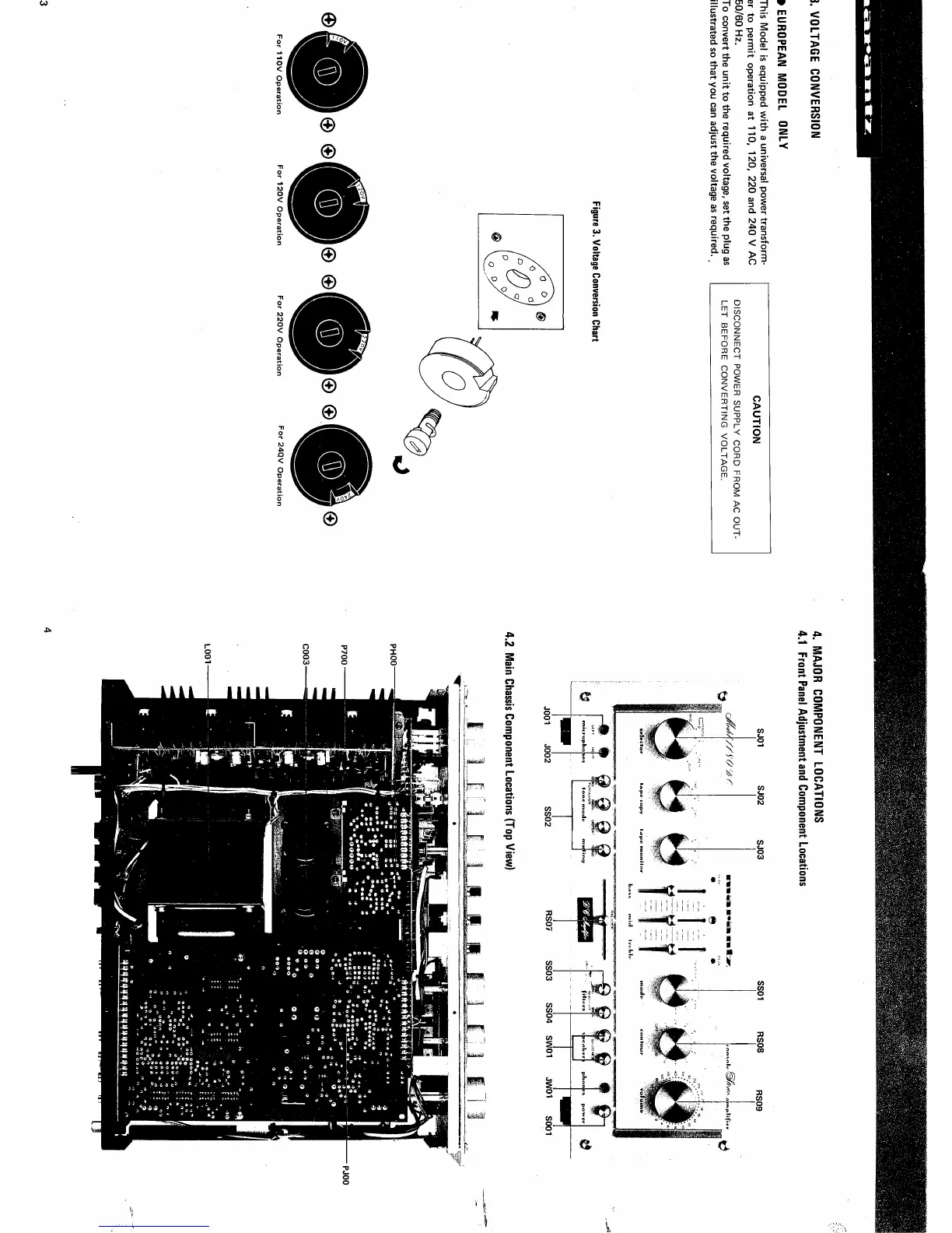 Marantz 1180DC - Voltage Conversion for Europe; Voltage Conversion Chart; Major Component Locations; Front Panel Adjustment and Component Locations