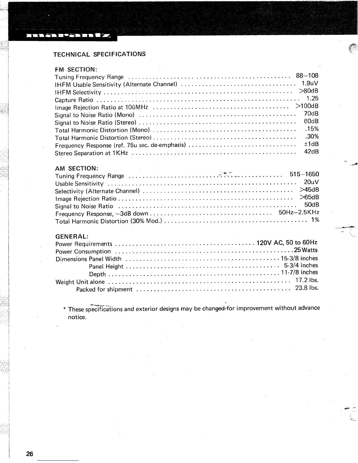 Marantz 125 - TECHNICAL SPECIFICATIONS; FM SECTION; AM SECTION; GENERAL