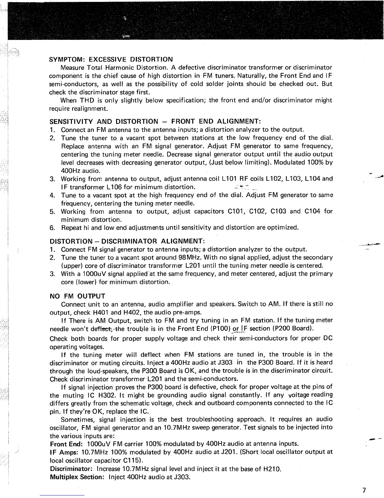 Marantz 125 - SYMPTOM: EXCESSIVE DISTORTION; SENSITIVITY AND DISTORTION FRONT END ALIGNMENT; DISTORTION - DISCRIMINATOR ALIGNMENT; NO FM OUTPUT