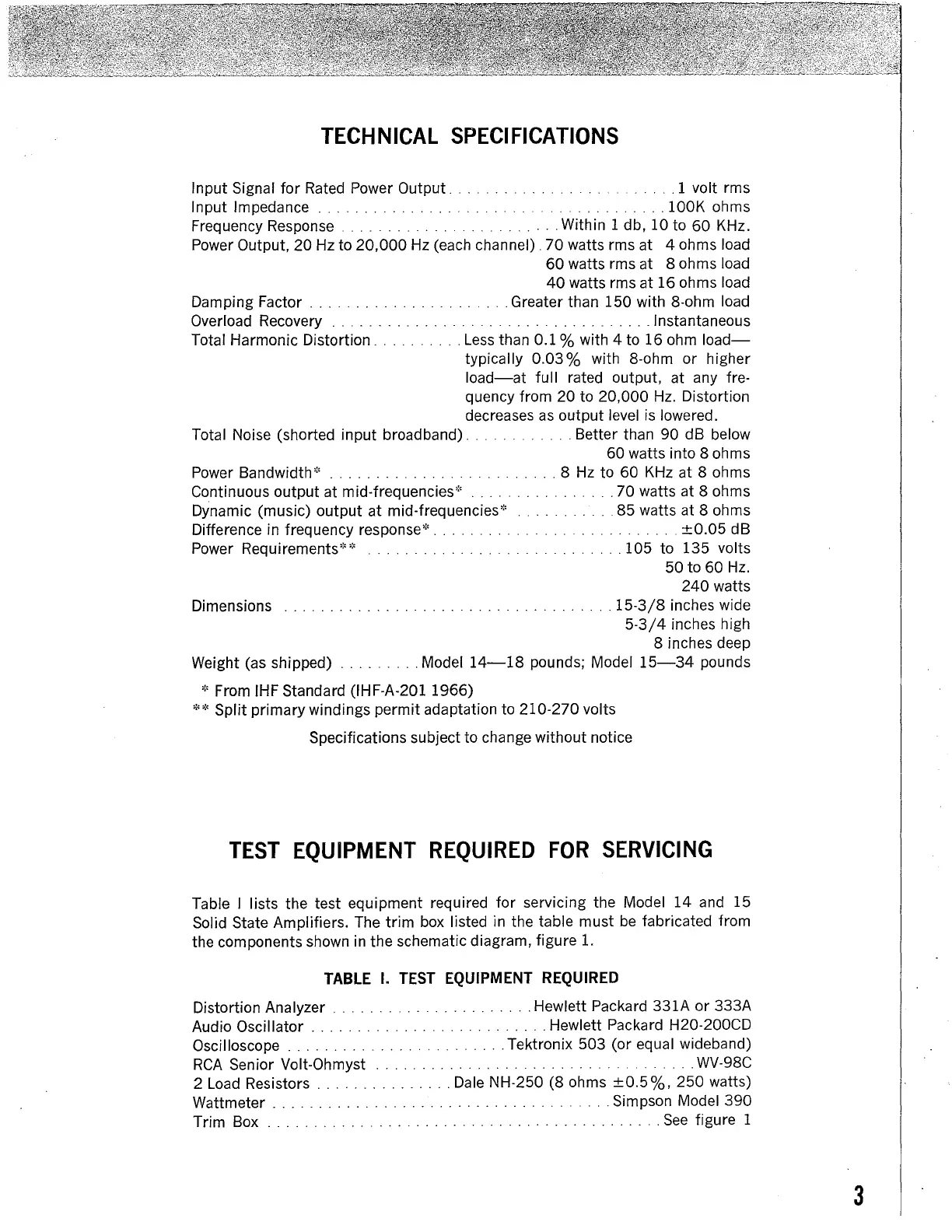 Table I lists the test equipment required for servicing the Model 14 and 15
