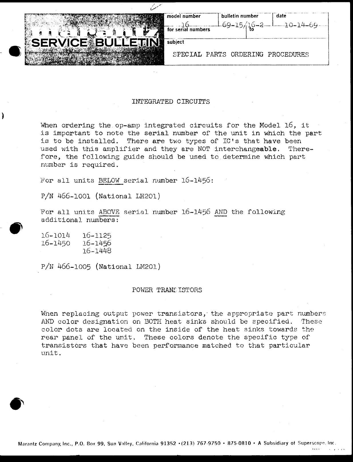 Marantz 16 - Special Parts Ordering Procedures (Bulletin 69-15;16-2); Integrated Circuits Identification; Power Transistors Specifications