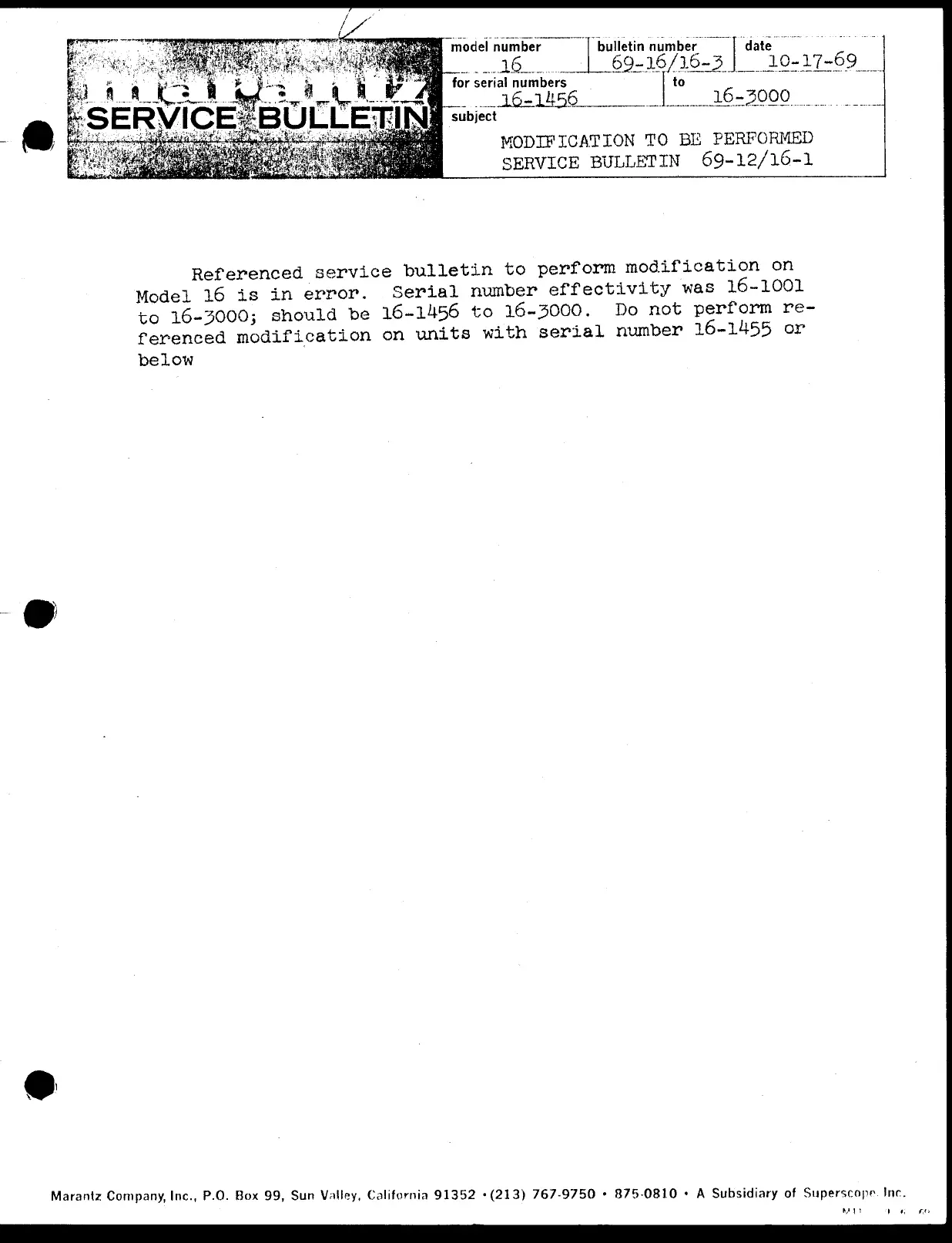 Marantz 16 - Correction to Modification Procedure (Bulletin 69-16;16-3); Correct Serial Number Effectivity