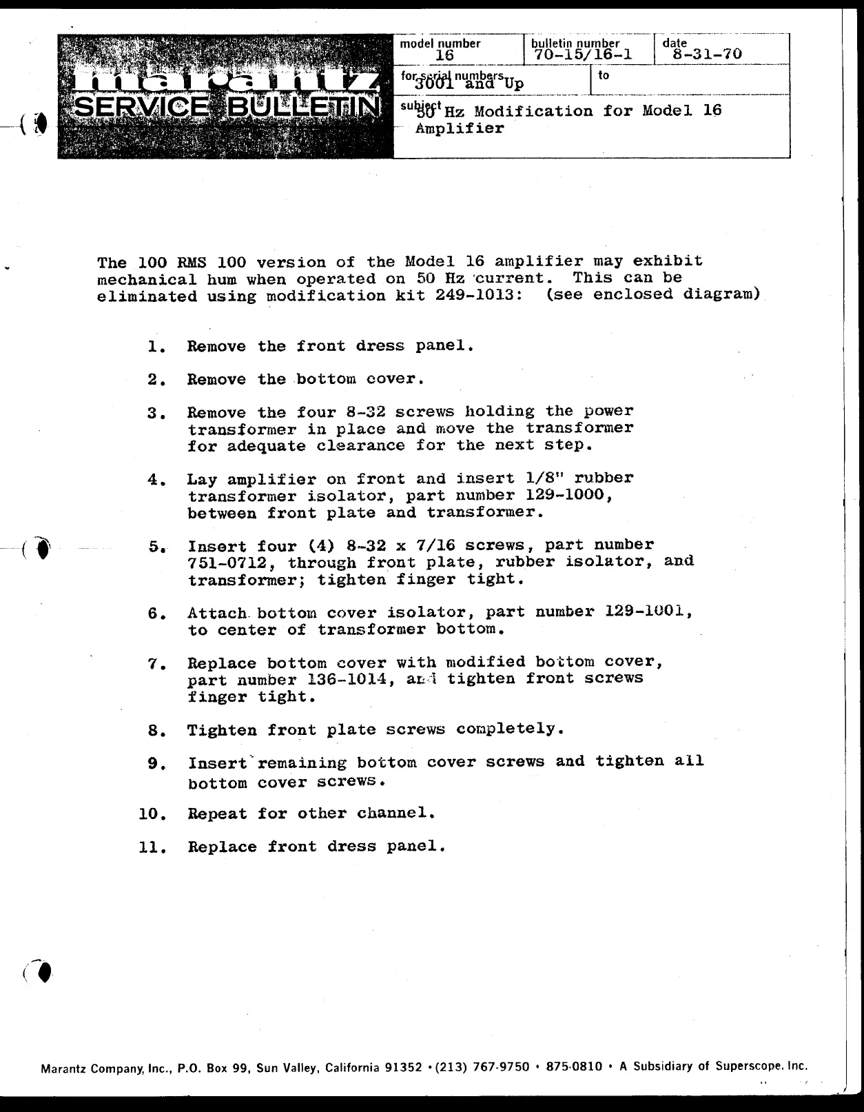 Marantz 16 - Hz Modification for Mechanical Hum (Bulletin 70-15;16-1); Eliminate Mechanical Hum on 50 Hz; Hum Modification Installation