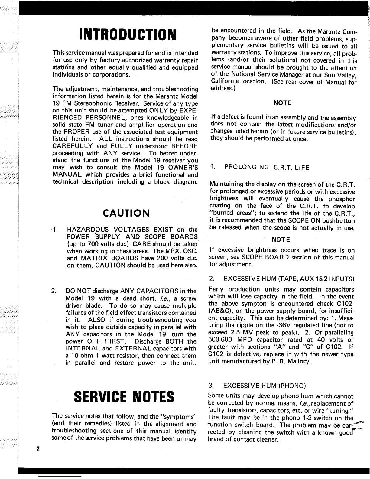 Marantz 19 - Introduction to Marantz Model 19 Service; Important Service Cautions; Service Notes and Field Issues