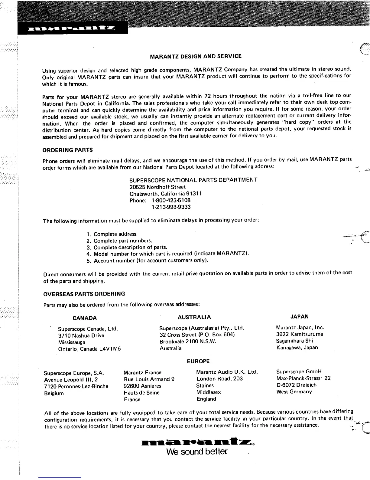 Marantz 2050 - Marantz Design and Service; Ordering Parts; Overseas Parts Ordering