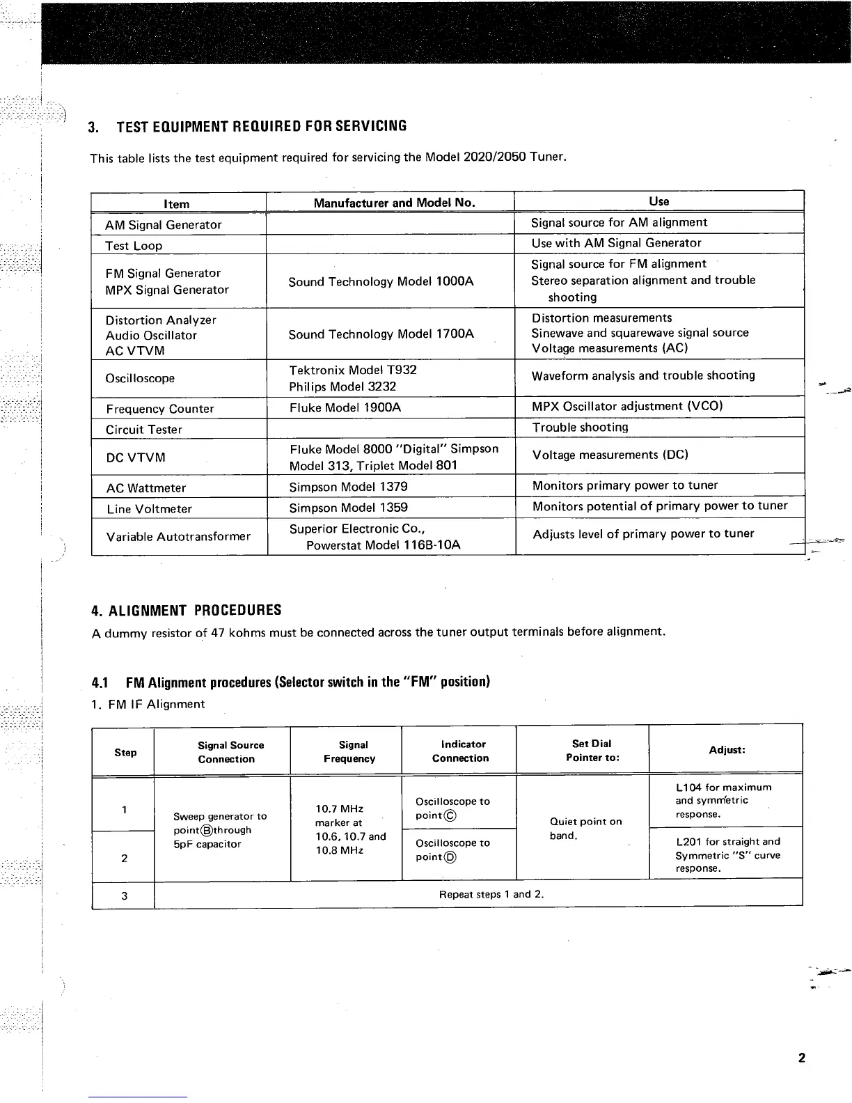 Marantz 2050 - Test Equipment Required for Servicing; Alignment Procedures; FM Alignment procedures (Selector switch in the FM position)