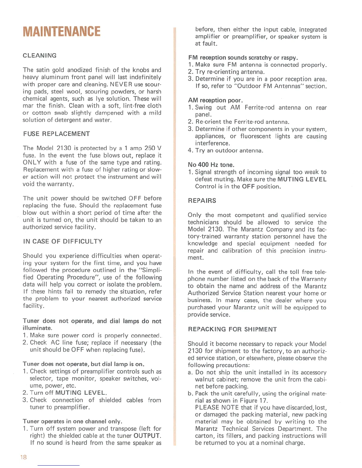 Marantz 2130 - MAINTENANCE AND TROUBLESHOOTING; Troubleshooting Common Operational Difficulties; Service and Repacking for Shipment