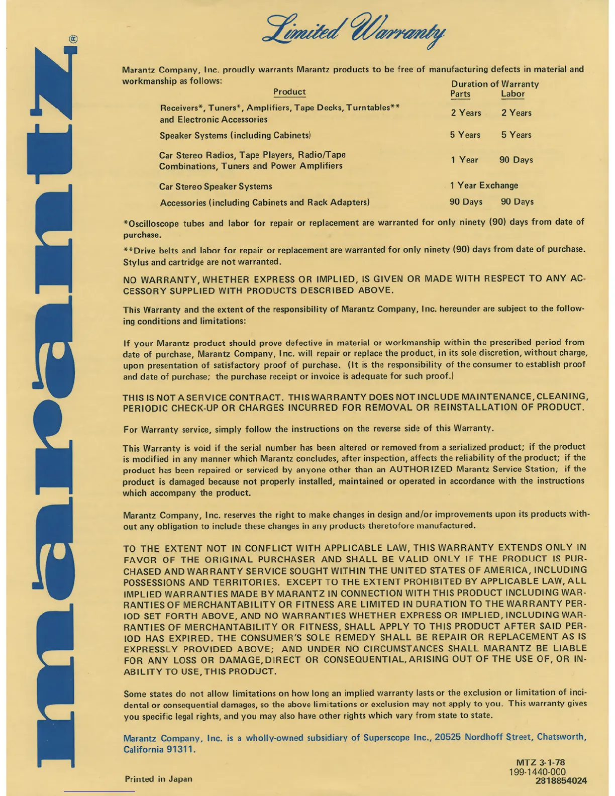 Marantz 2130 - LIMITED WARRANTY INFORMATION; Warranty Terms, Coverage, and Limitations