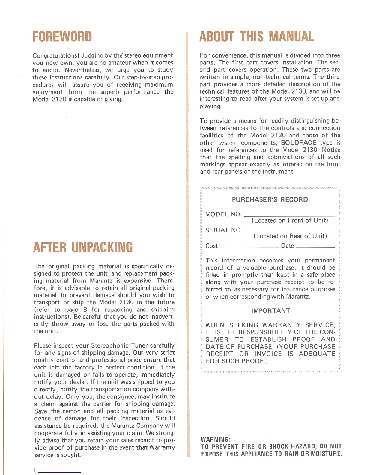 Marantz 2130 - AFTER UNPACKING; Inspect for Shipping Damage and Retain Packaging