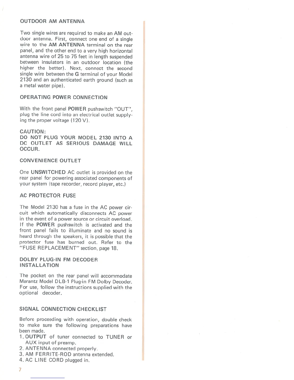 Marantz 2130 - POWER AND ACCESSORY CONNECTIONS; Signal Connection Checklist