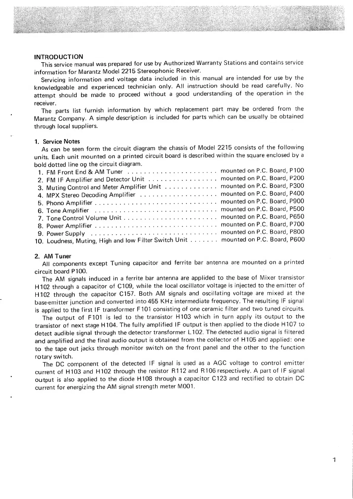 Marantz 2215 - Introduction to Marantz 2215 Service Manual; Service Notes and Unit Breakdown; AM Tuner Operation and Alignment
