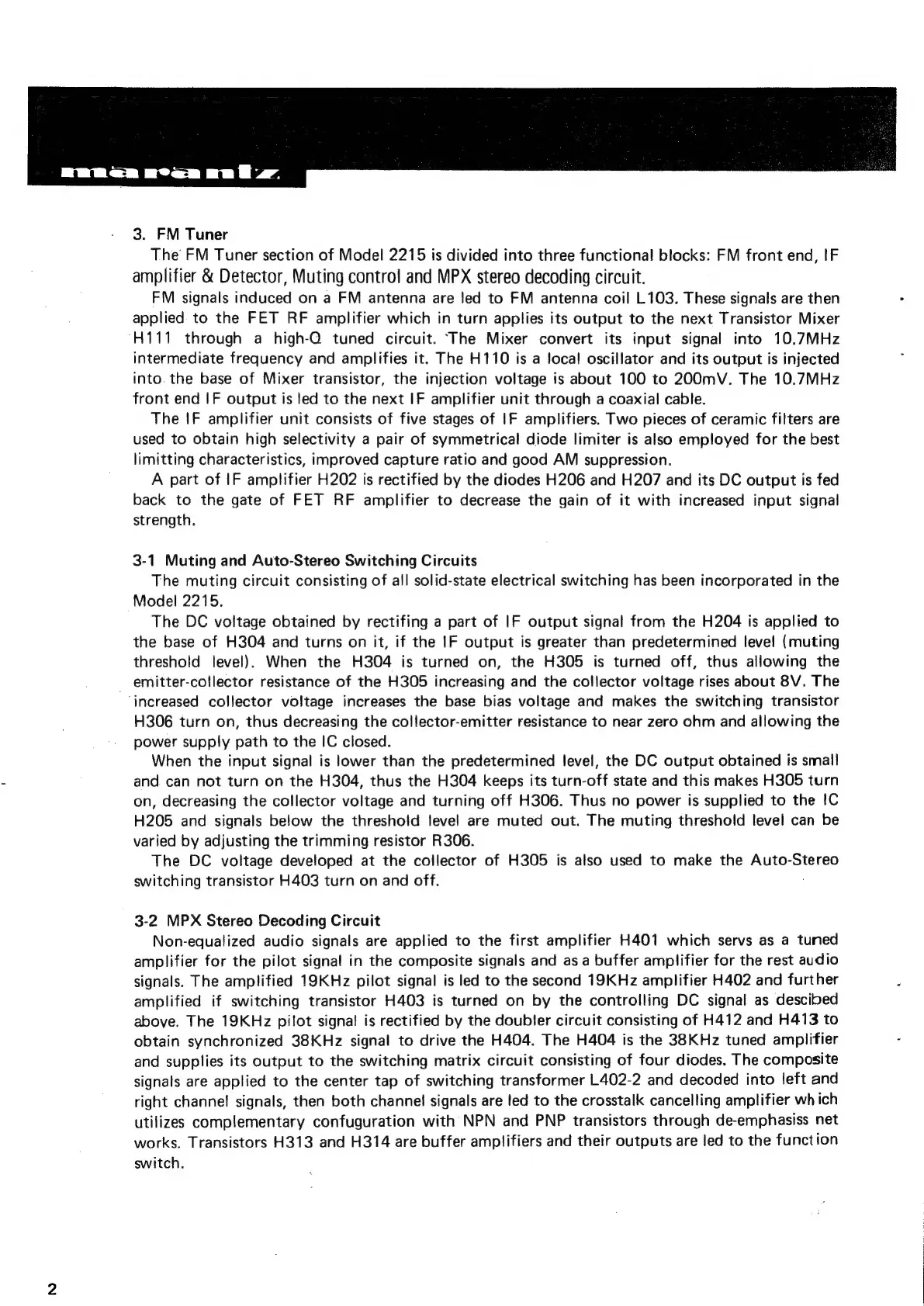 Marantz 2215 - FM Tuner Operation; Muting and Auto-Stereo Switching Circuits; MPX Stereo Decoding Circuit