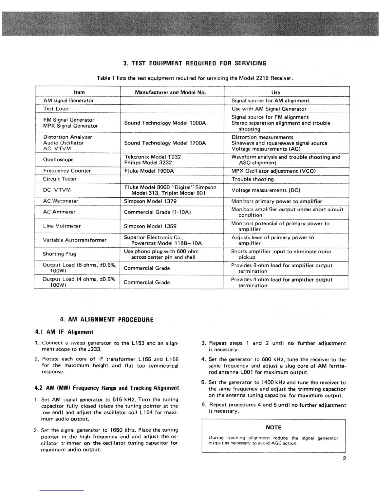 Marantz 2218 - 3. Test Equipment Required for Servicing; Required Test Equipment List; 4. AM Alignment Procedure; AM IF Alignment