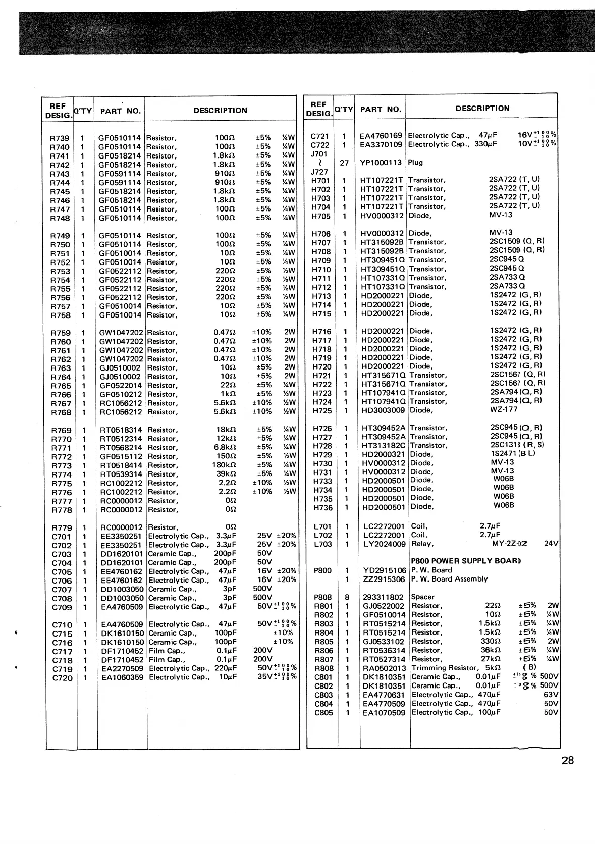 Marantz 2225L - Parts List - Sections R, C, H, J, P; Component Details R, C, H, J, P