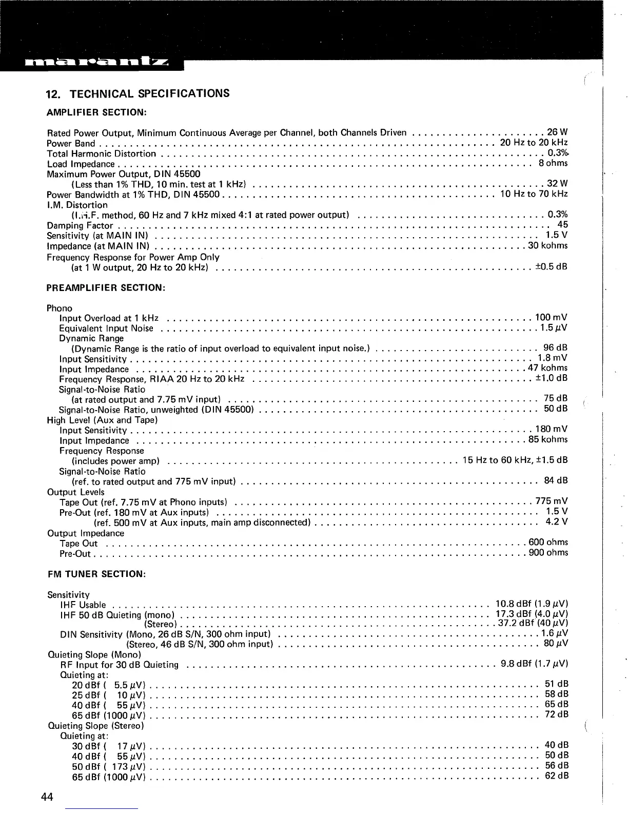 Marantz 2226 - Technical Specifications; Amplifier Section; Preamplifier Section; FM Tuner Section
