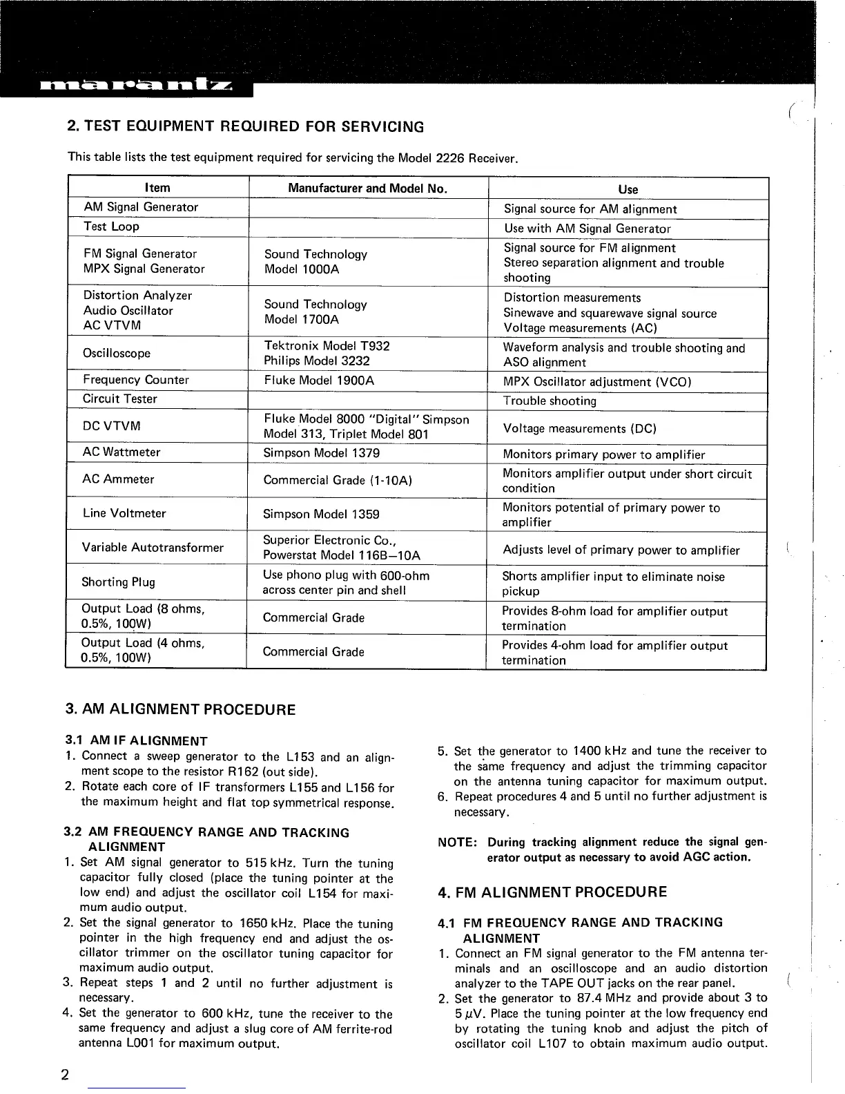 Marantz 2226 - Test Equipment Required for Servicing; AM Alignment Procedure; AM IF Alignment; AM Frequency Range and Tracking Alignment