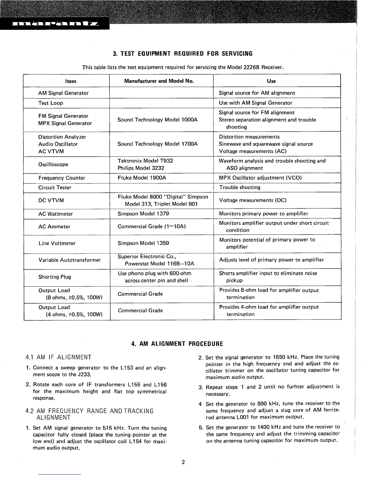 Marantz 2226B - 3. TEST EQUIPMENT REQUIRED FOR SERVICING; 4. AM ALIGNMENT PROCEDURE; 4.1 AM IF ALIGNMENT; 4.2 AM FREQUENCY RANGE AND TRACKING ALIGNMENT