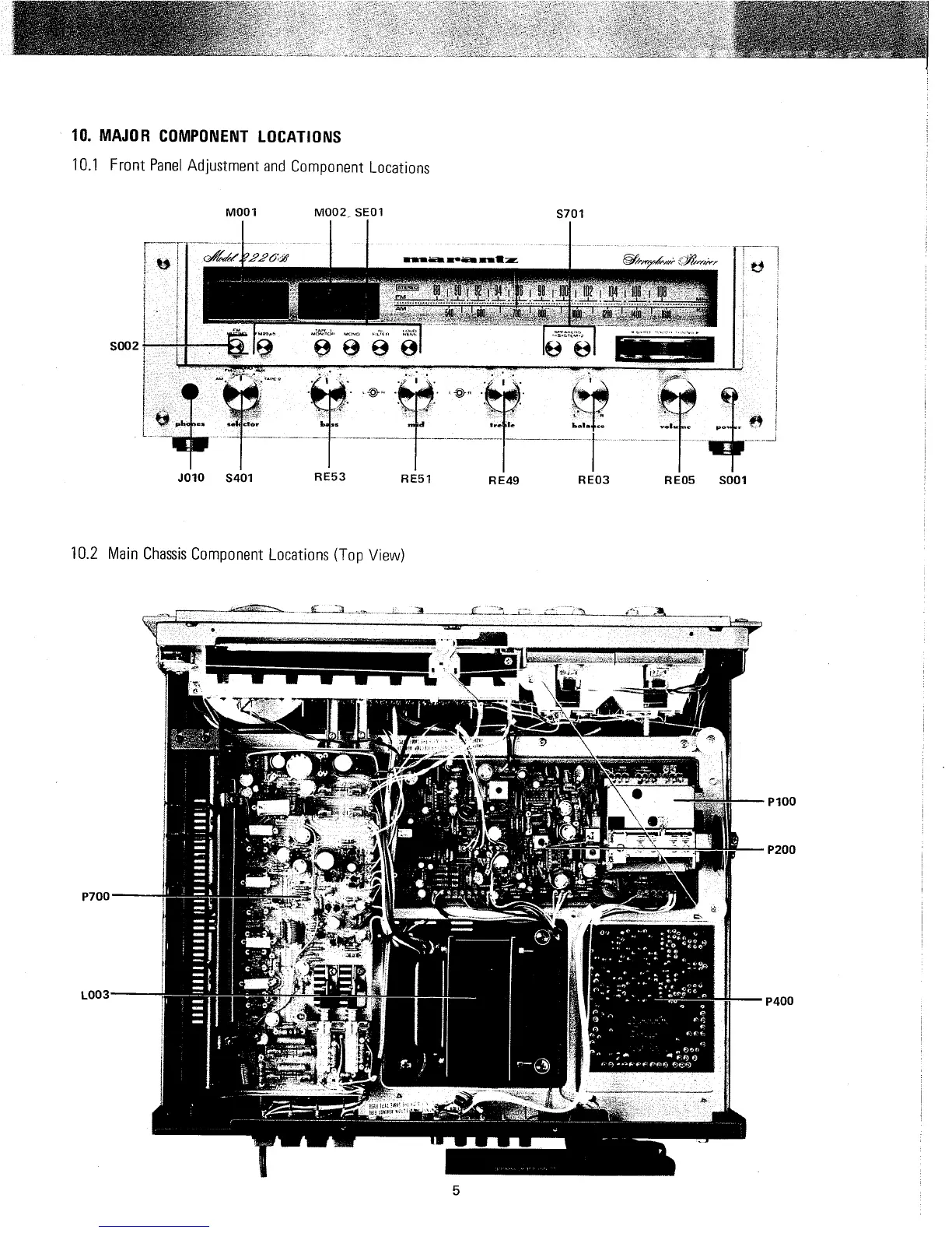 Marantz 2226B - Major Component Locations; Front Panel Adjustment and Component Locations; Main Chassis Component Locations (Top View)