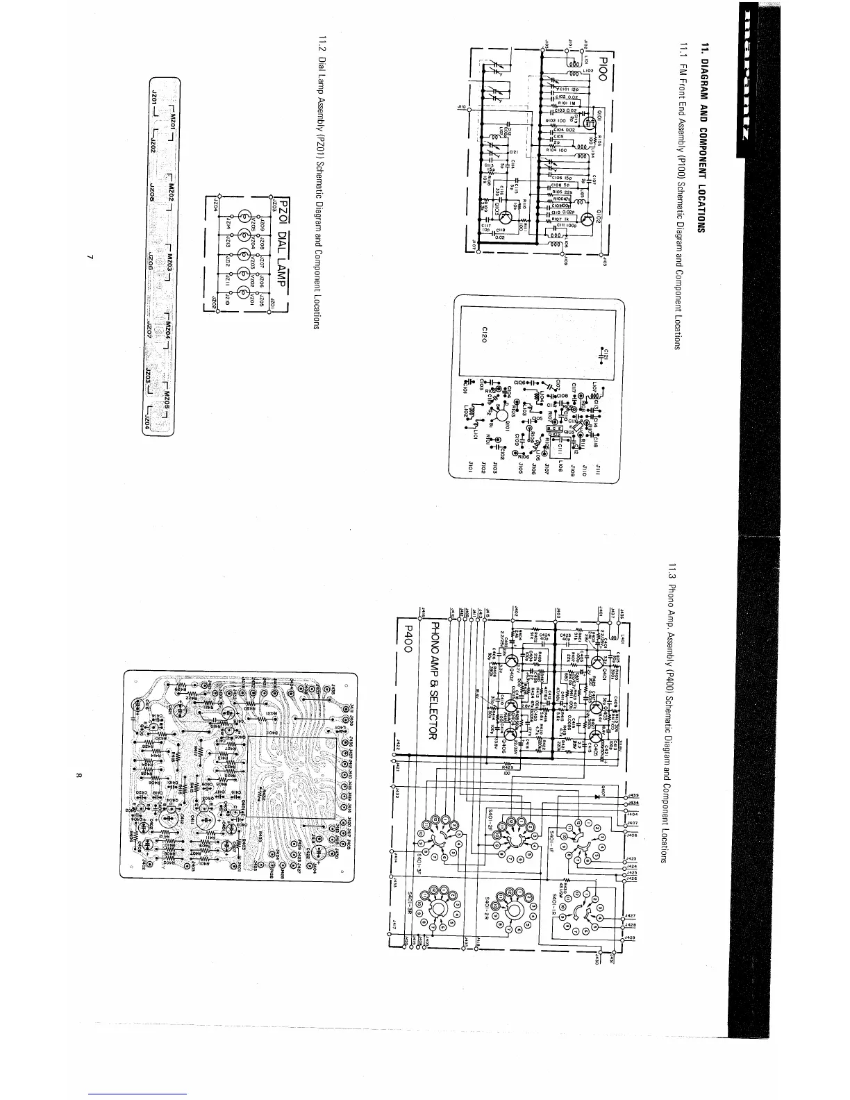 Marantz 2226B - Diagram and Component Locations; FM Front End Assembly (P100) Schematic Diagram and Component Locations; Dial Lamp Assembly (PZ01) Schematic Diagram and Component Locations; Phono Amp, Assembly (P400) Schematic Diagram and Component Locations