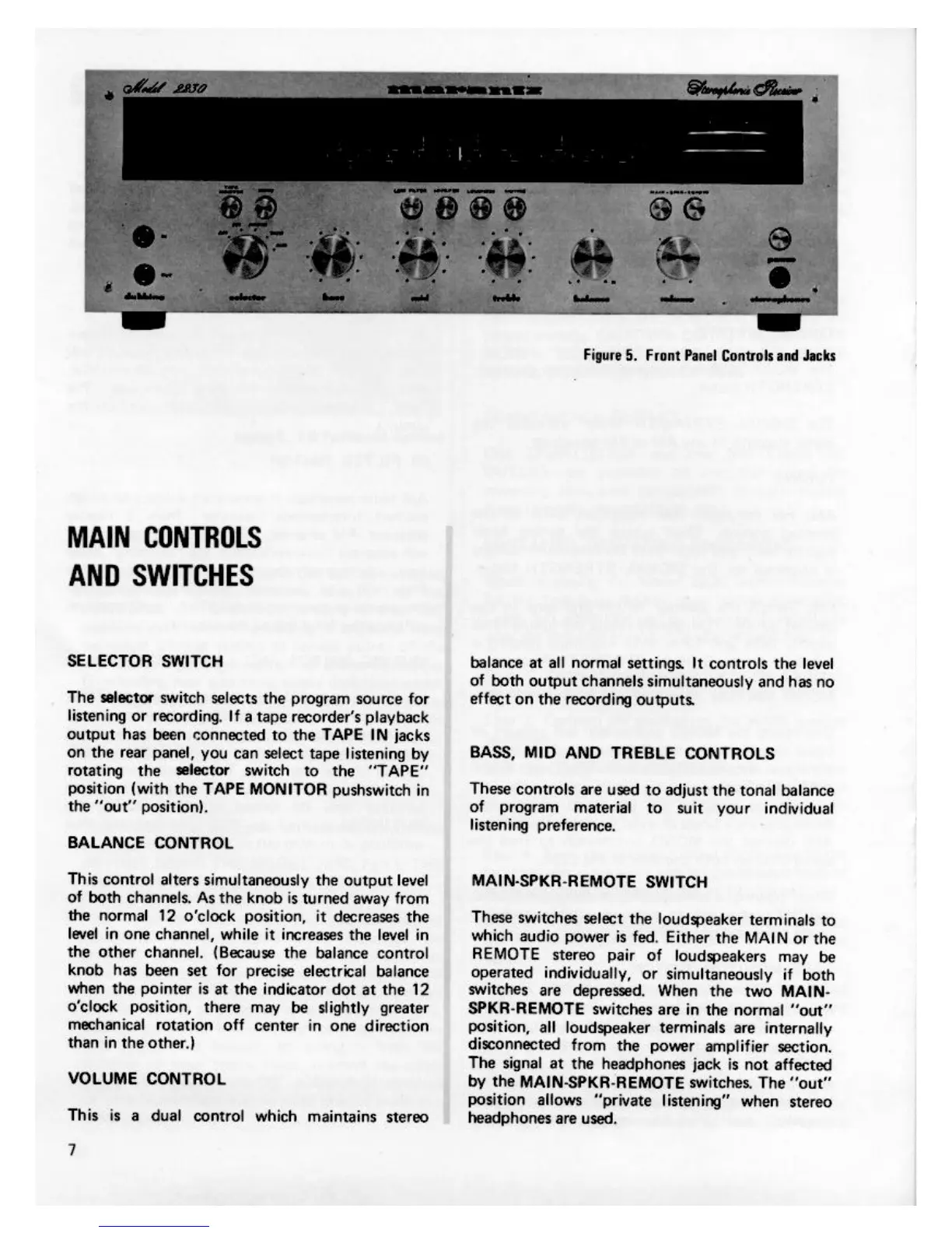 Marantz 2230 - Front Panel Controls; Program Source Selection; Balance and Volume Adjustment; Tone Controls (Bass, Mid, Treble)