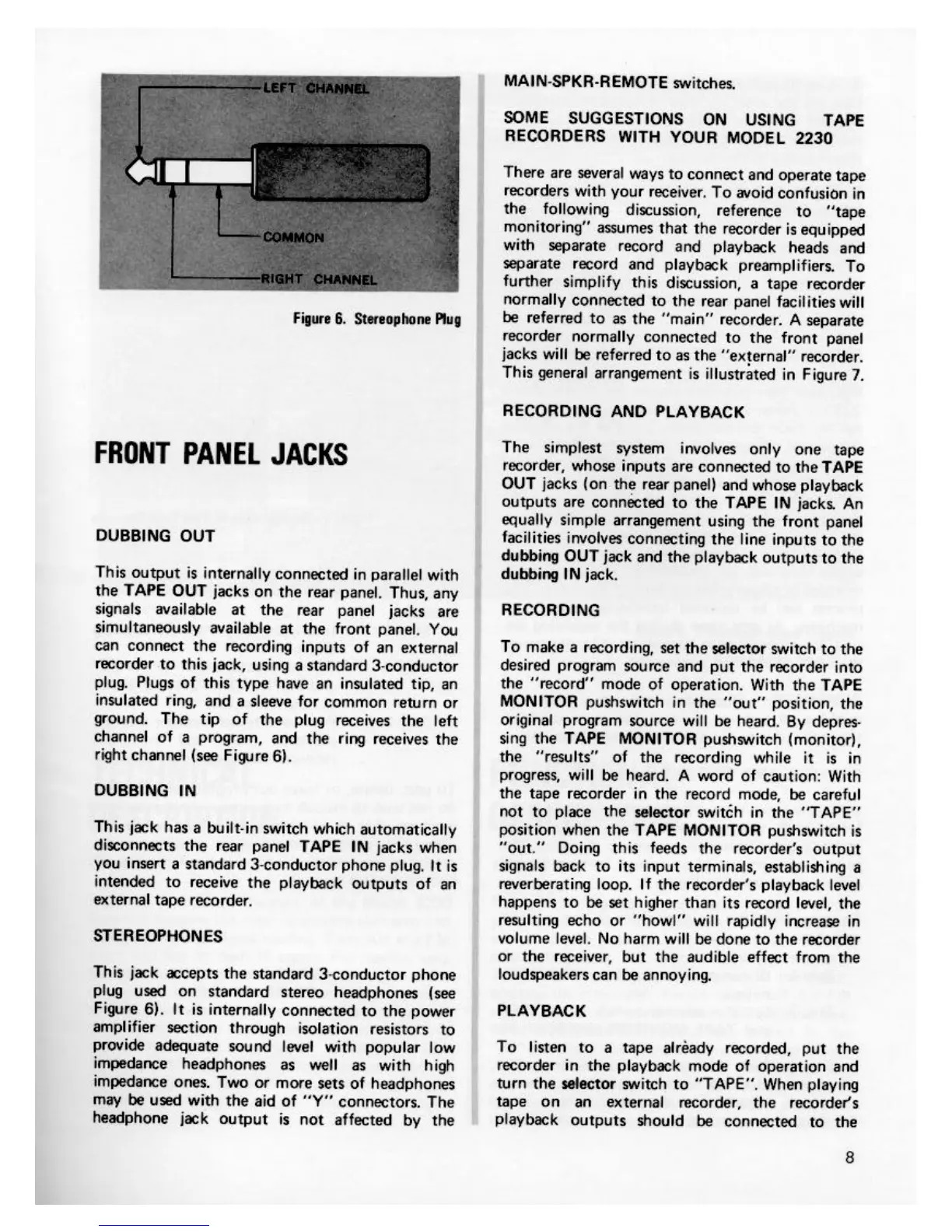 Marantz 2230 - Front Panel Jacks and Tape Use; Front Panel Jacks Explained; Tape Recorder Connectivity; Recording and Playback Procedures