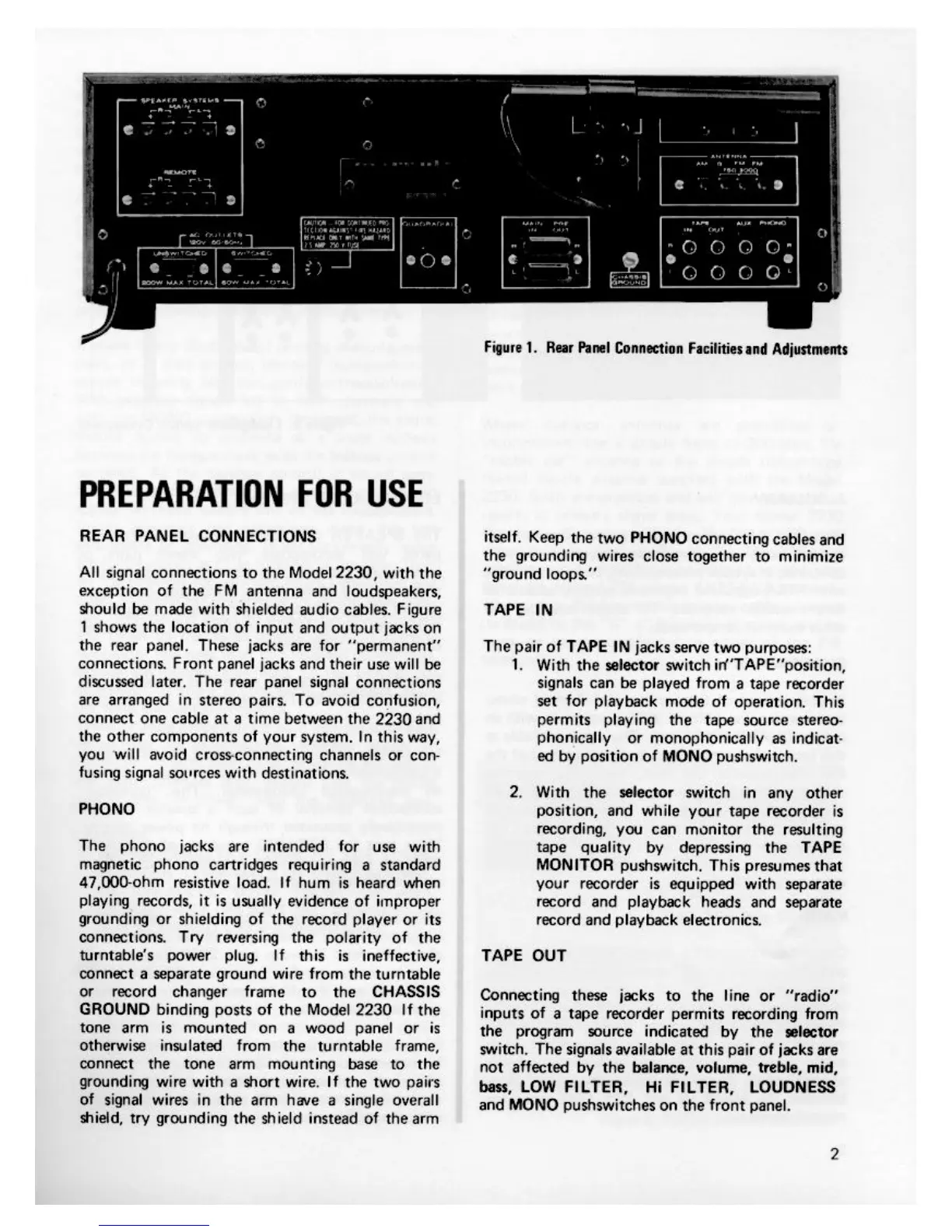 Marantz 2230 - Preparation for Use; Rear Panel Connections; Phono Input and Grounding; Tape Input and Output Jacks