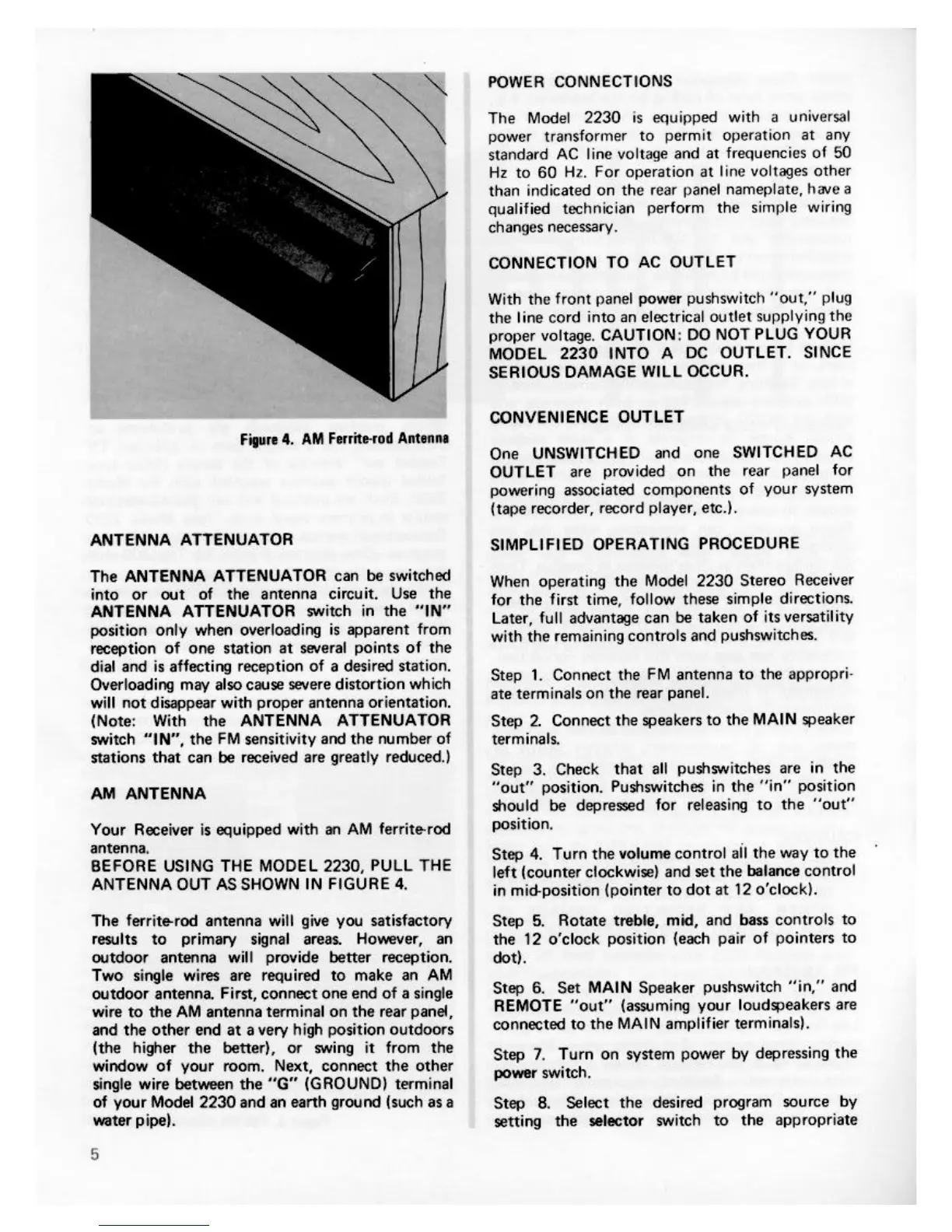 Marantz 2230 - Antenna and Power Setup; AM Antenna Setup; Antenna Attenuator Function; Power Connections and Safety